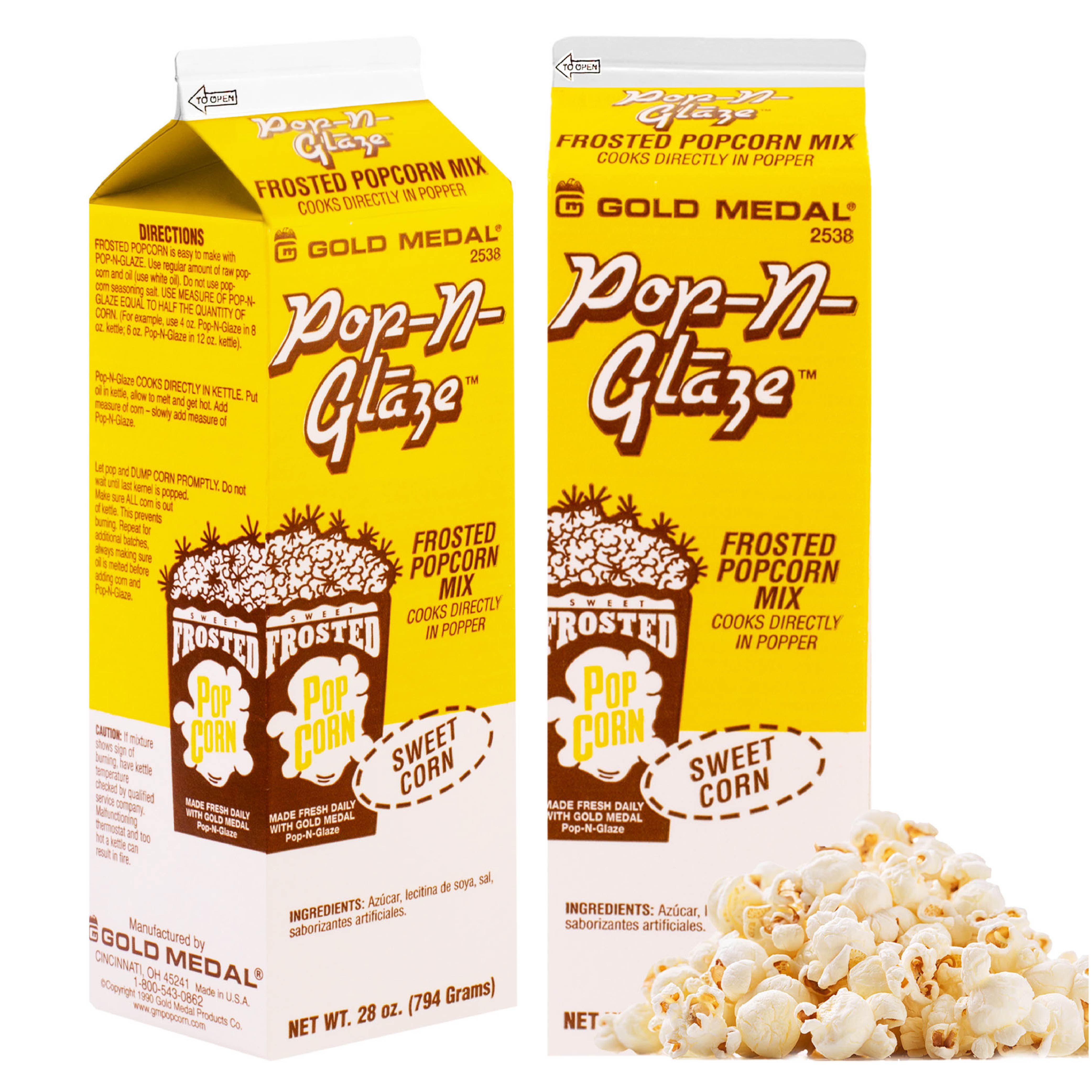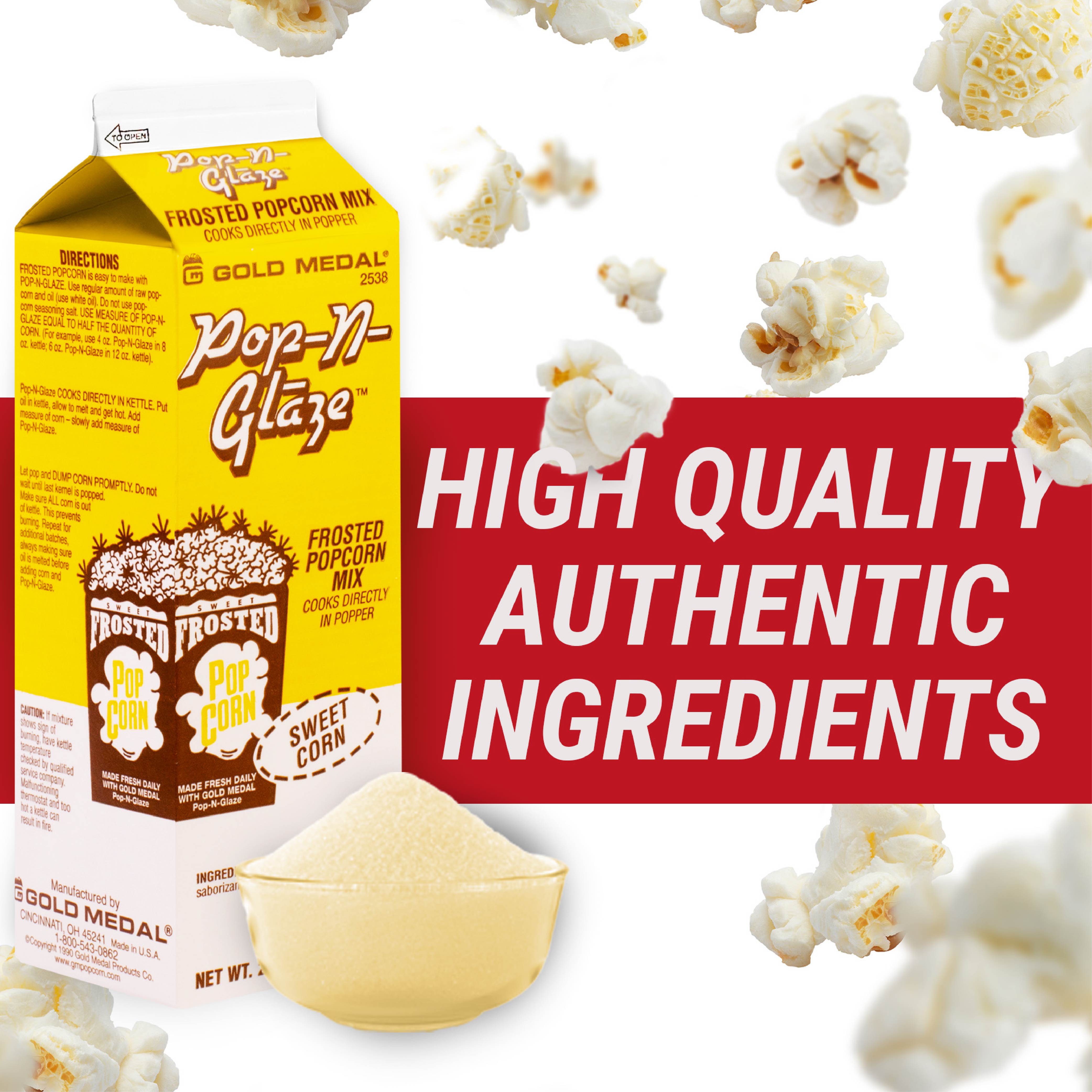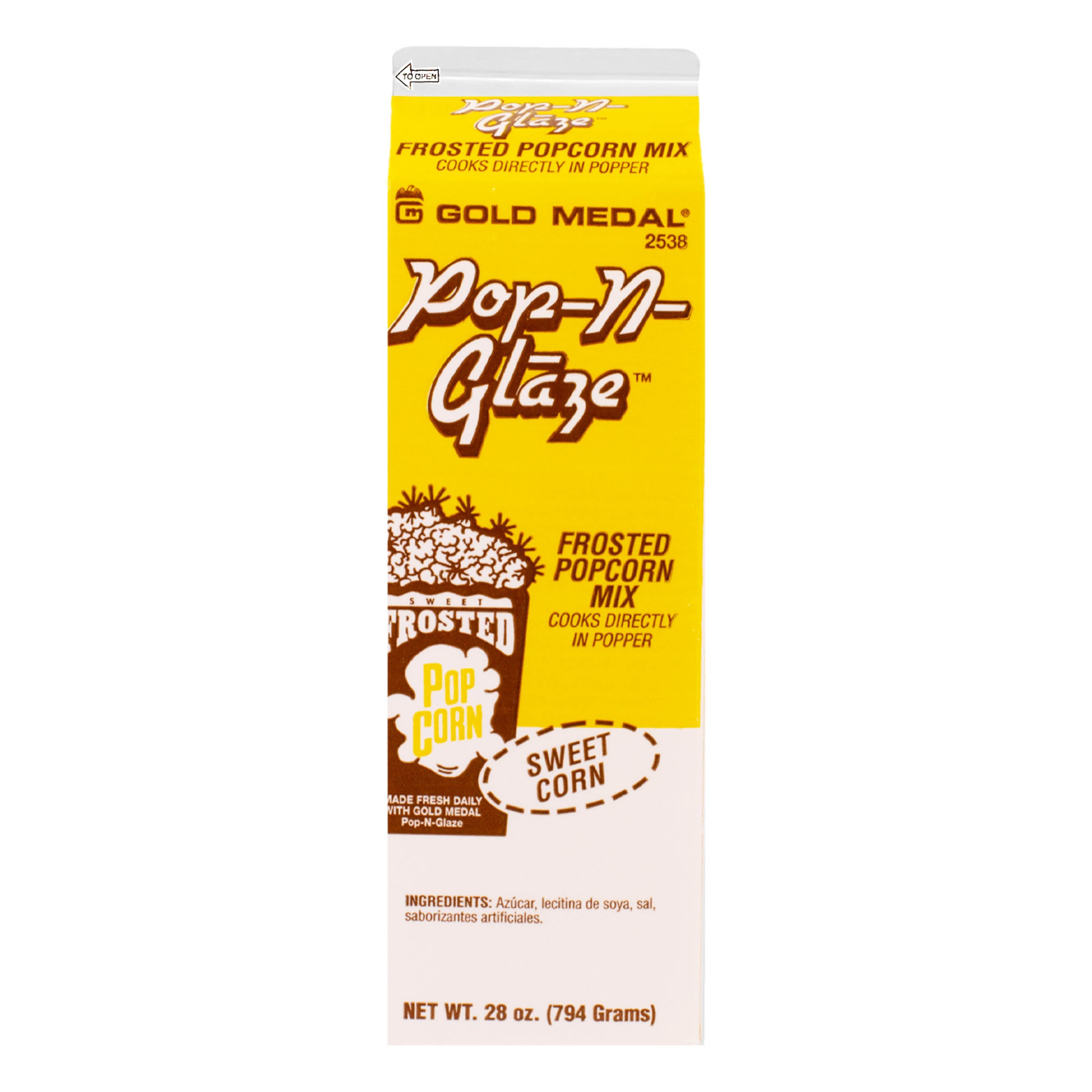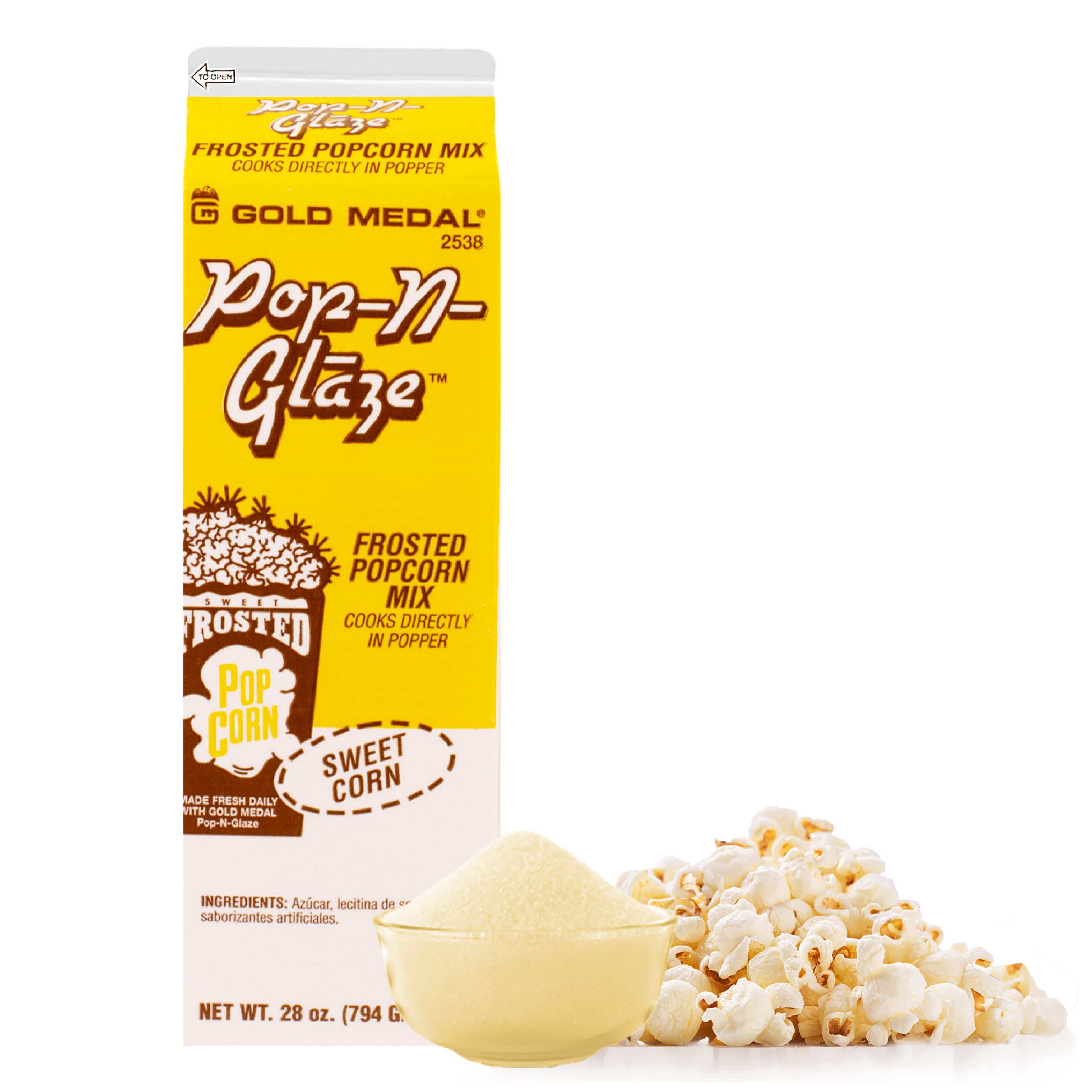 Boost that sugary taste and create gourmet popcorn at its finest with a simple sweet glaze. The Pop-N-Glaze Neutral Sweet Frosted Popcorn Mix #2538 from Gold Medal is perfect for all-size operations. Simply add the mix to your kettle with corn and oil.