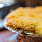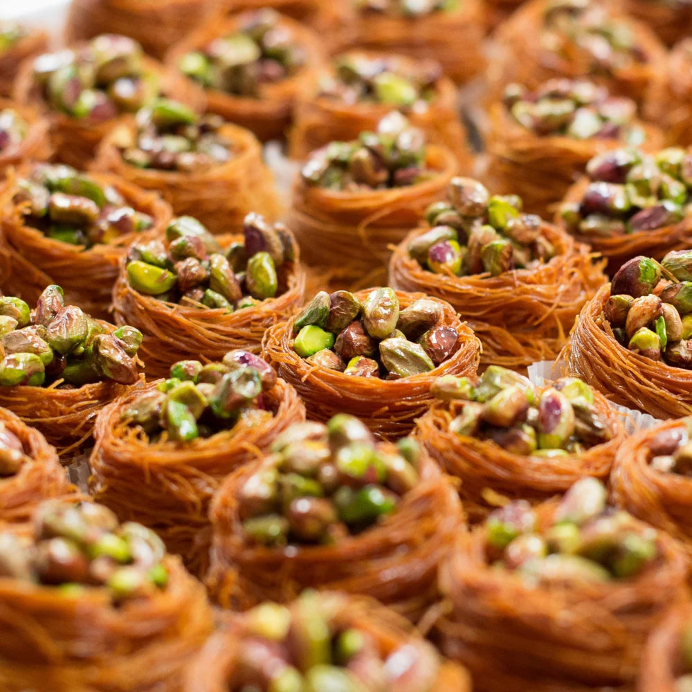 Finely shredded filo pastry that’s been perfectly roasted to a golden-brown colour, offering a light, crispy texture ideal for both sweet and savoury applications.