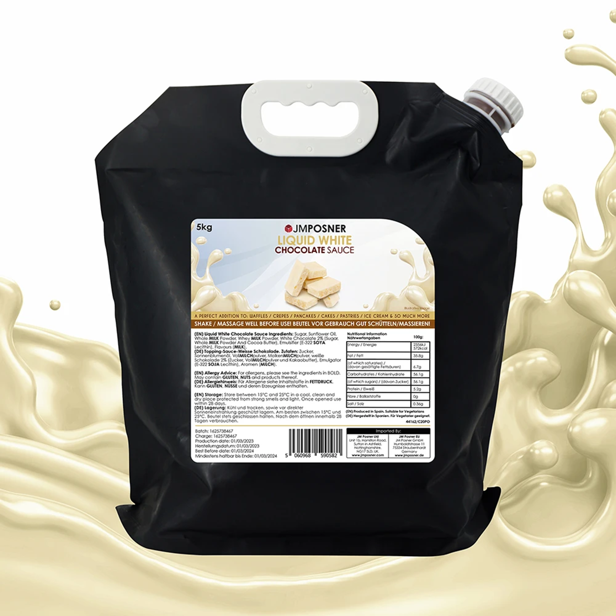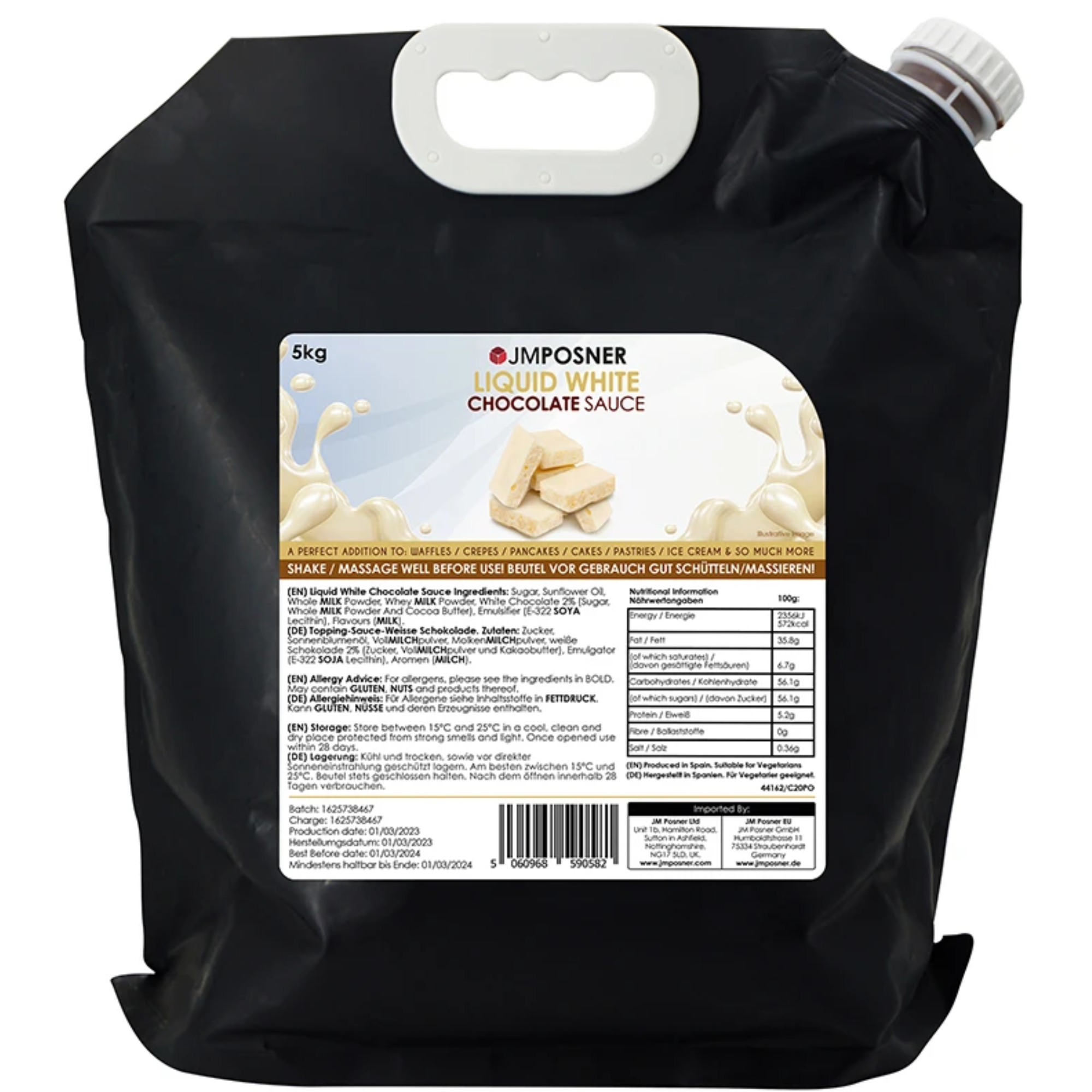 Introducing our 5kg Liquid White Chocolate Sauce, the perfect alternative to traditional formed chocolate for your dessert creations. This innovative packaging offers a range of benefits:
